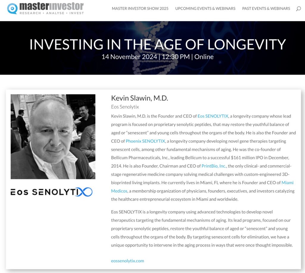 In this longevity-investing focused webinar, Dr. Slawin will be presenting Eos SENOLYTIX, giving a sneak preview of the groundbreaking data he will be presenting in March at the International Conference on Sarcopenia and Frailty in a plenary presentation in Toulouse, France.